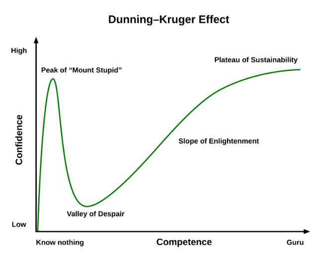 But, noticeably, when you start to gain competence, your confidence can spike way too high too soon out of proportion with your experience and expertise, placing you atop "Mount Stupid". Then, as you gain more competence, you can descend into the "Valley Of Despair" as you realise there's a lot more to your field than you had realised.
